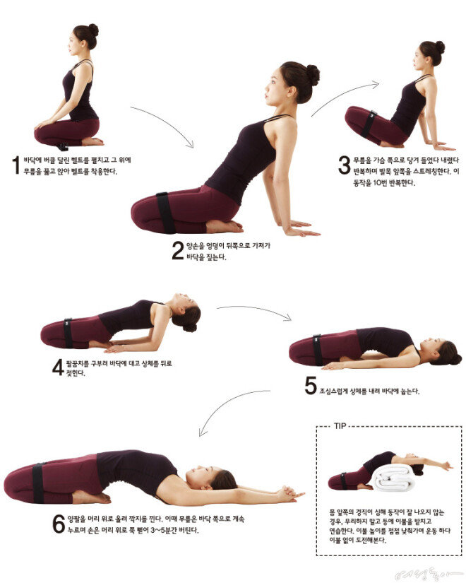 고개를 숙이고 앉아서 생활하는 평소 자세와 정반대의 동작으로 몸 앞쪽에 위치한 근육을 이완시키는 동작. 허리의 곡선과 골반을 바로 잡고 허벅지 앞쪽 라인을 예쁘게 만든다. 운동 전 벨트의 길이를 조절해 허벅지 가운데에 꽉 맞게 착용할 것. 운동할 때는 계속 숨을 내쉬면서 몸을 늘리고, 정해진 시간 동안 동작을 버티는 것이 힘들면 1분씩 나눠서 해도 된다.