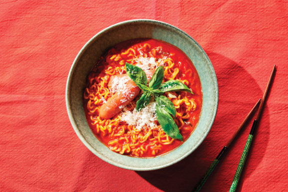 토마토와 라멘이 만나 매콤한 해장 스파게티 같은 맛을 느낄 수 있다. 라면은 면이 너무 굵지 않은 신라면이나 진라면을 추천한다.