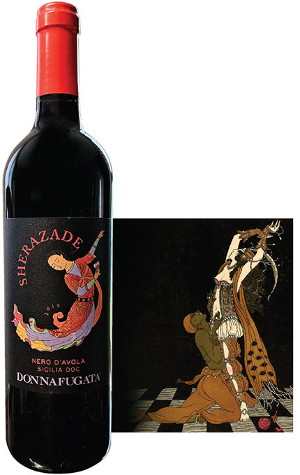 세라자데는 ‘셰에라자드’로 알려진, ‘아라비안나이트(천일 야화)’에 등장하는 왕비의 이름에서 가져온 것이다. 와인 라벨에는 얇은 보랏빛 드레스 위에 금장의 붉은색 가운을 겹쳐 입은, 검고 긴 머리카락을 늘어뜨린 여인이 지그시 눈을 감은 채 마치 무용을 하듯 한 팔을 우아하게 들어 올리고 다른 한 손엔 와인 잔을 들고 서 있는 모습이 그려져 있다. 이 여인은 19세기 나폴리와 시칠리아왕국 페르디난트 1세의 왕비이자 오스트리아 여대공이었던 마리아 카롤리나(1752~1814)를 모티프로 그렸다고 한다.