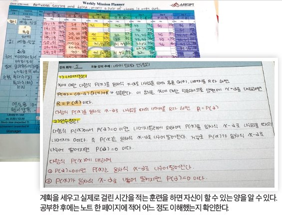 일단 공부 잘하는 학생은 가족 생활 루틴이 잡혀 있는 경우가 많습니다. 아이가 생활 속 루틴을 공부 습관으로 이어가게 되거든요. 예를 들어 하루가 끝나면 마무리 독서를 하고 자는 것처럼, 하루 공부가 끝났을 때 마무리로 공부했던 거 노트에 써보고 플래너를 정리한 다음 공부를 마치는 거죠. 생활 습관이 잘 잡힌 부모가 결국은 아이들의 공부 습관을 형성하는 엔진을 만들어주는 거고, 그 엔진이 절대 실행력에서 가장 중요한 요소입니다. 그리고 두 번째 공통점이 감정 컨트롤을 잘한다는 거예요. 부모님들이 예전보다는 화를 잘 참으시더라고요(웃음).