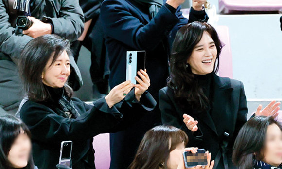 2월 9일 이부진 호텔신라 사장(오른쪽)이 이모인 홍라영 전 리움미술관 총괄본부장과 함께 아들 임동현 군의 휘문고 졸업식 밴드 공연을 즐기고 있다.