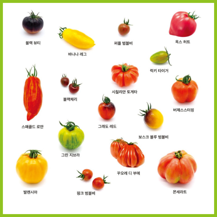 토마토 품종에 따라 맛과 식감, 풍미는 천차만별이다. 골든 주빌리(Golden Jubilee)의 식감은 카스텔라와 같이 부드럽고 포슬포슬하며, 새콤한 풍미가 매력적이다. 그린 지브라(Green Zebra)는 아삭아삭하며 풀 향이 도드라지고 강렬한 레몬 계열의 신맛이 느껴진다. 퍼플 범블 비(Purple Bumble Bee)는 과육이 단단하며 씹을수록 토마토의 깊은 향이 올라온다. 첫입은 새콤하지만 짠맛으로 마무리된다.