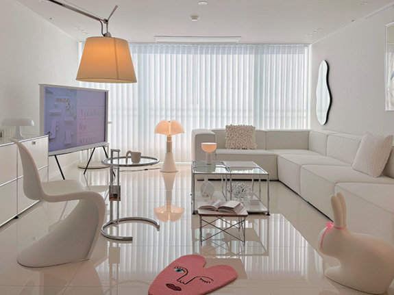 화이트 컬러 가구와 조명으로 미니멀하게 꾸민 거실.