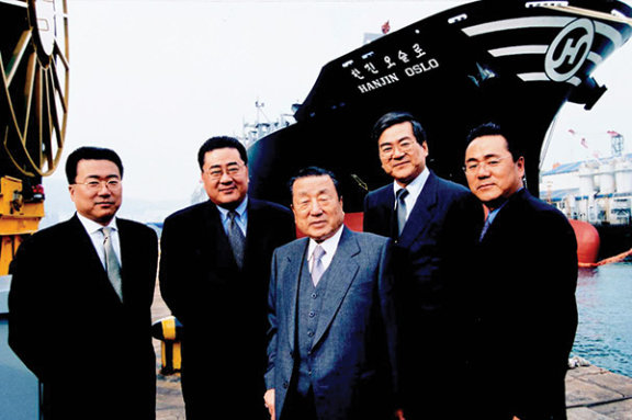 1998년 ‘한진 오슬로호’ 앞에서 한진가 가족이 기념 촬영을 했다. 왼쪽부터 조정호 메리츠금융지주 회장, 고 조수호 한진해운 회장, 고 조중훈 창업주, 고 조양호 한진그룹 회장, 조남호 한진중공업 회장.