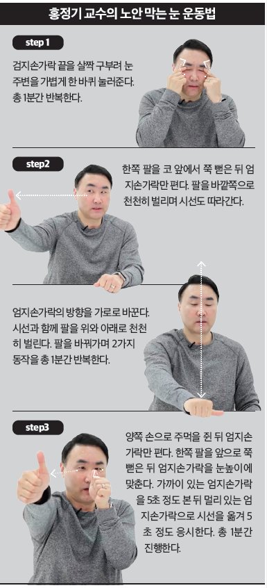 시력 감퇴를 느끼는 젊은 층이 늘고 있다. 다양한 외적 요인으로 인해 눈 근육이 탄력성을 잃으면서 노안이 가속화되는 것. 회복 운동 권위자 홍정기 교수는 노안을 지연시키는 방법으로 ‘눈 근육 이완 운동법’을 지목했다.