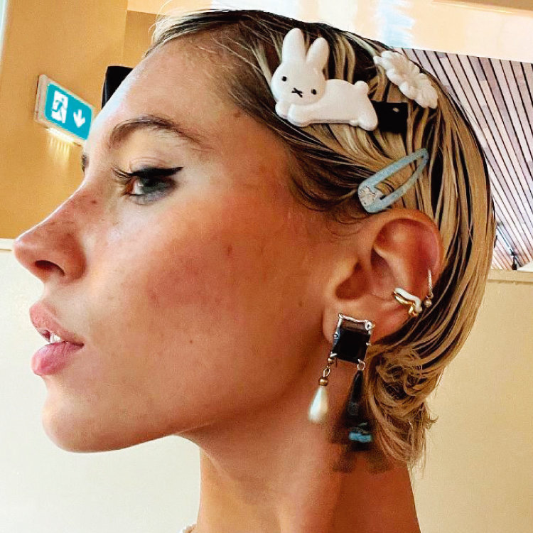 주드 로의 딸이자 배우, 모델로 활동 중인 아이리스 로. 스톤이 세팅된 드롭 이어링에 디자인이 다른 2개의 피어싱을 레이어드했다. 스타일이나 사이즈가 다른 이어링을 여러 개 믹스 매치할 때는 일단 컬러를 통일하고, 양쪽이 아닌 한쪽만 착용해 언밸런스함를 유지하는 것이 포인트.