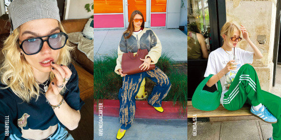 틴티드 선글라스는 일상적인 캐주얼 룩에서야말로 진가를 발휘한다. 스타일링에 큰 공을 들이지 않아도 컬러 렌즈 하나면 전체적인 룩의 완성도가 달라진다. 모델 앨리스 호프는 티셔츠와 청바지 차림에 눈동자가 훤히 드러나는 연회색 렌즈의 보잉 선글라스를 매치해 뉴트로 감성을 한껏 살렸다. 여기에 두건 스타일의 모자를 더해 쿨한 1970년대풍 바이브를 완성했다. 패션 인플루언서 라라 역시 마찬가지. 오렌지 브라운 틴티드 선글라스에 스트라이프 패턴 폴로 셔츠를 매치해 앨리스와는 달리 위트 있고 장난기 가득한 무드다. 틴티드 선글라스는 티셔츠, 후드 점퍼, 트레이닝팬츠 같은 스포티한 아이템과도 완벽한 합을 이룬다.