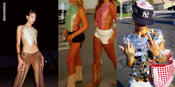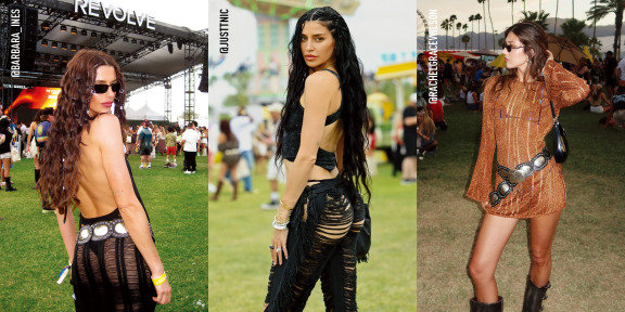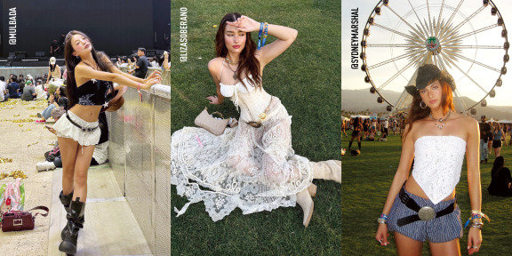 페스티벌에 화려한 조명이 빠질 수 없다. 반사판 따윈 필요 없는 스팽글 장식 톱은 무대보다 더 강렬한 조명 효과로 시선을 잡아끈다. 실버부터 골드, 그린, 핑크까지 컬러에 따라 분위기와 애티튜드는 천차만별이다. 먼저 블링블링한 스타일링의 대표 주자, 다우스 멘도사부터. 골드 메탈 시퀸 톱에 아찔한 커팅 디테일이 돋보이는 빈티지 진을 매치해 이목을 집중시켰다. 미러볼처럼 반짝이는 스팽글 톱으로 한낮의 코첼라 밸리를 누빈 패션 인플루언서 시에라 레나도 빼놓을 수 없다. 섹시한 무드와 상반되는 스포츠 스냅백에 골반까지 내려 입은 헐렁한 트레이닝팬츠, 체커보드 백까지 그만의 스왜그 넘치는 믹스 매치 룩도 눈여겨볼 만하다. 한편 디지털 크리에이터 이사벨라 스토비는 허리 라인을 드러낸 과감한 시퀸 톱에 손바닥만 한 마이크로 쇼츠와 벨리 체인, 웨스턴 부츠로 절친 에밀리와 시밀러 룩을 연출해 밤거리를 훤히 밝혔다. 걸을 때마다 조명을 켠 듯 반짝이는 스팽글 장식이 여름밤의 열기를 고스란히 전하는 듯하다.